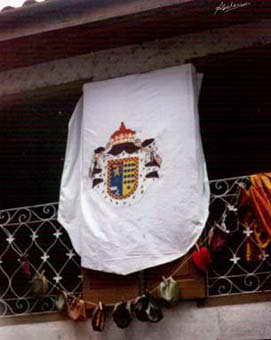 Escudo nobiliario durante a "Festa dá Istoria" baixo este colgan unha docena de Kipas ou Yarmulkes judaicos. ¿Acaso nos deixa ver algunha alegoría pasada de ton?