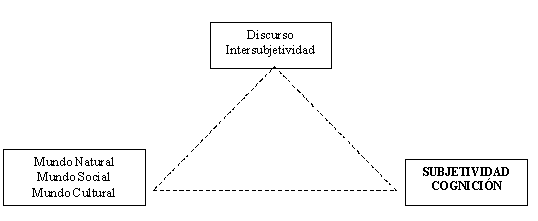 Entonces, la propuesta que haré tiene sus raíces no en una teoría psicológica como tampoco en una teoría puramente social, sino en una teoría del lenguaje con base social, en una teoría sobre la práctica enunciativa. Se trata de una teoría mediadora de la producción de sentido que inscribe el lenguaje en una dimensión dialógica y explora el papel activo del intercambio verbal y su unidad discursiva (el enunciado) en la generación de procesos graduales de generalización. Como podemos observar en el triángulo, la interfaz no sería la cognición como sí lo es para otros estudiosos del lenguaje (van Dijk por ejemplo), la interfaz aquí, entre lo social y lo subjetivo es el lenguaje, pero el lenguaje en tanto que actividad enunciativa, el lenguaje como actividad discursiva.