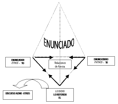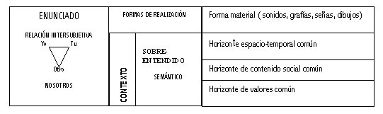 La situación de enunciación específica, el locutor, el tema y el interlocutor son aspectos que se integran en la dinámica de semantización del enunciado. Un enunciado será entonces no el resultado de dos sujetos sino de por lo menos tres sujetos enunciadores (un trílogo) cuyas relaciones sociales de diferente intensidad en él se manifiestan. En el enunciado se pone en escena, se realiza y evidencia un acto social de evaluación, un acto de apreciación social. La tonalidad, la intención y la expresividad que adquiera el enunciado estarán dando cuenta de los tipos de relaciones sociales puestos en escena en el enunciado, y estas relaciones sociales van a orientar las formas de realización sintáctica y funcional que tomará el enunciado.