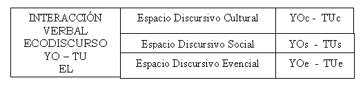 La propuesta está en relación con la convergencia simultánea de por lo menos tres espacios discursivos; discursivos porque corresponden a la construcción de imágenes en el escenario discursivo: Espacio Discursivo Cultural, Espacio Discursivo Social y Espacio Discursivo Evencial (antes denominado Evenimencial o Experiencial) y sus correspondientes sujetos discursivos (YOc-TUc, YOs-TUs, YOe-TUe) (Martínez 1991: 1993).