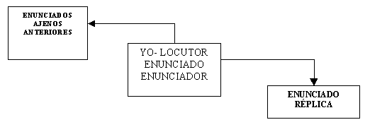 Así, en todo enunciado siempre se instaura una relación dinámica de fuerzas vivas desde el acto de enunciación intencional realizado con respecto a unos enunciados anteriores ajenos y de manera predictiva con respecto a unos posibles enunciados o réplicas posteriores, lo cual por supuesto crea una dinámica compleja e intertextual en el mismo enunciado.