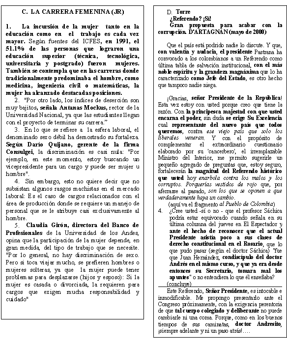 No voy a hacer en este momento un análisis exhaustivo de los textos, me interesa que observemos el juego de la polifonía que se presenta en el texto C y la manera como se han construido las imágenes de Enunciador, Enunciatario y Lo Dicho o lo Referido. El análisis de la construcción de la imagen del Enunciatario en el texto D (ver subrayados) lo dejo para otra ocasión.