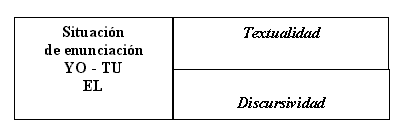 Sugiero que las formas de manifestación del enunciado se realizan a través de una doble dimensión discursiva que ocurre de manera simultánea en el enunciado: la textualidad y la discursividad, la cohesión y la coherencia respectivamente [4] ; corresponden a la construcción arquitectónica del discurso cuyas bases significativas se realizan a través de conexiones que evidencian la dinámica relacional social que se instaura entre los tres enunciadores que intervienen en el proceso de semantización del enunciado durante el acto discursivo.