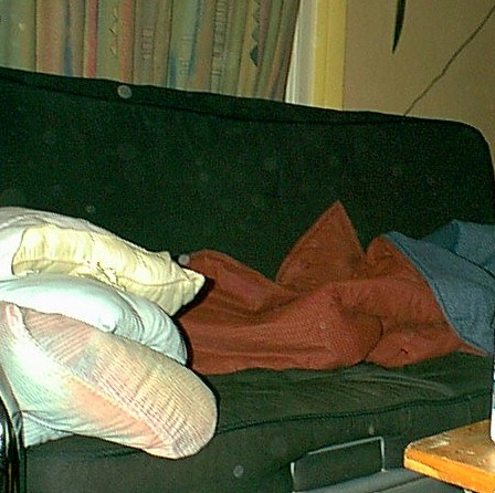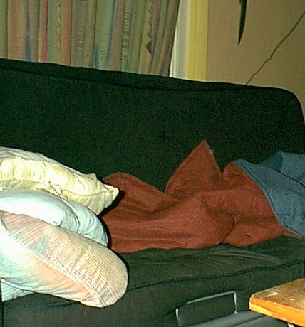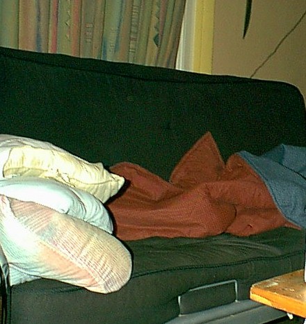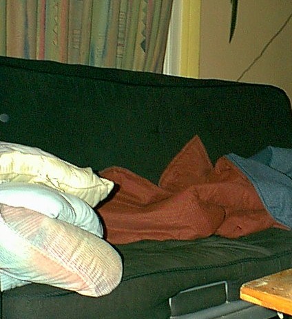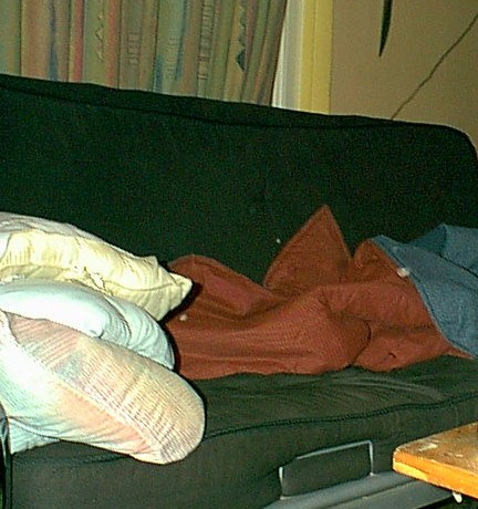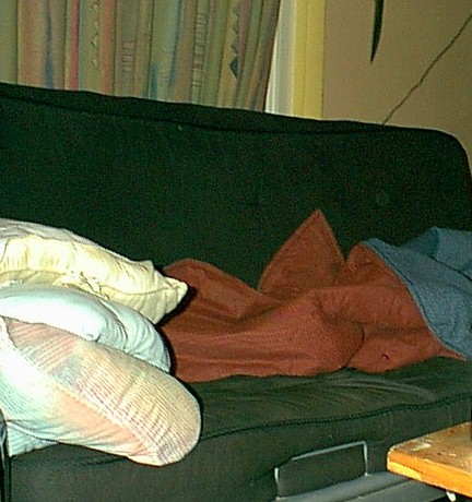 | Here's why you need to be careful that no one's walking through an area, or there's a wind blowing. I tossed a blanket hard into the air in the photo above. What you're seeing is dust ...rather nasty, eh? Although the similarity to many orb photos, notice the clarity and density of the dust ... it's different than orbs. It's just best as a precaution to set the scene carefully. |