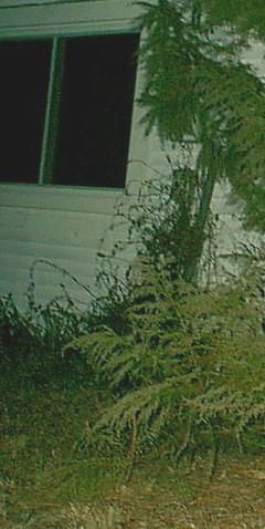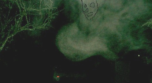 | Above and Below: This photo was taken in my sideyard. I got nothing but this on the evening it was taken. The before and after shots are empty of phenomena. My husband has kinda drawn where he saw a face, below. |