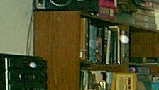 | There are actually six or so in this photo. You can probably pick out four on this page. The two easiest to see are the one in front of the CD player and the one moving in front of the book case. (left) These photos were taken in my bedroom. There are two in the one to the left (in front of the unicorn's leg and on the curtain), then the two on the right. |