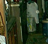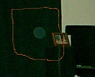 | I put these three photos together because I think they're all of the same orb. You tell me... Left, taken in the hall just outside of the bathroom. Top, taken in the bathroom, in front of the shower curtain. Bottom, taken in the bedroom, just in front of my dresser. (There's also one in the left photo, faint, towards the center of the photo) |