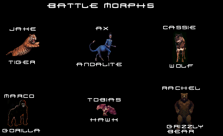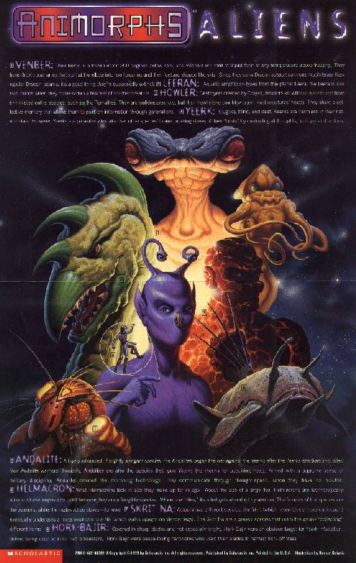 to go to the page. Here are some pics of the calendar from TailStrike. Pic 1 2 3 4 Click here for the poster that will be included in the Animophs Calendar from TailStrike Some details of the Animorphs videogame from Alisai: Based on the Nickelodeon TV show and Scholastic book series by the same name, Animorphs is Single Trac and GT Interactive's path to the 7-13 year old game audience. Animorphs is a single player, action/strategy game in which you play one of five characters from the animated series through various adventures that lead to the completion of the game. The Animorph part comes in when your characters turn into various animals, such as a tiger, dragonfly and about 14 others throughout the game. There will be about 23 levels in which you morph in and out of your human character and into the various animal that is available to your character at that time. You'll have a dragon blaze weapon when you're acting as a human and when you've changed into an animal, you'll have the animal's battle traits-in some cases flight in other cases fight. There will be about 21 enemy aliens to battle, some of which are not standard Animorphs characters, but rather Single Trac original designs. The game is really early in development, so gameplay was not available, however we should hear more in the coming months. Pics of the videogame (some