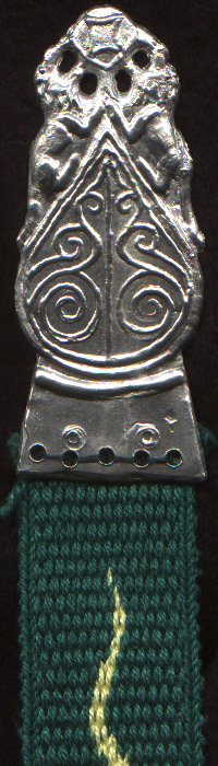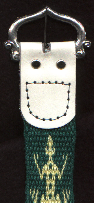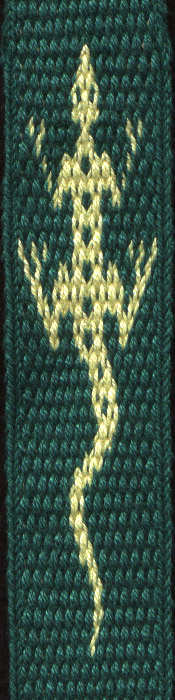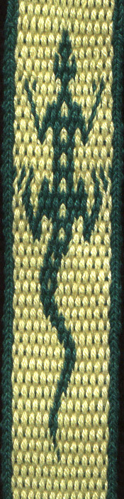 Turning sequence: You will notice that even ignoring the colour difference, that the lizard on the left is actually different than the lizard on the right. They are the same point on the belt though. This results from where in the turning sequence you decide to start your pattern (ie nose results from turning "pattern" cards either forward or backward) because that affects whether the twining is S or Z. As an interesting point, the back side of the work will always show you what the other start position looks like (but in reversed colours). I couldn't decide which lizard I liked best so I alternated, I also alternated which direction the tails swished, just for fun. |
