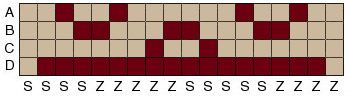 Warp Layout: Turning Sequence: The turning pattern for this one is a little odd. It's actually 7 forward, 7 back. I don't know about you, but my counting sucks, I just paid close attention to the pattern, turning at points of the star and when the white showed up in the centre of the oval in the middle of the star. |
