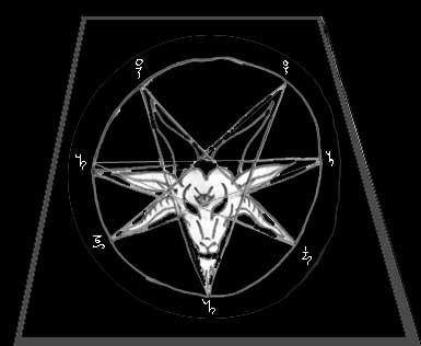 Hexagram of Satan - Represents "As Above, So Below," or the materialization of the Satanist's Will upon the black earth, as drawn from desire & ether. Macrocosm {The Satan Force} & Microcosm {The Self} combined as one. The All-One. Crowned with the Torch of Reason & Enlightenment, with the base representation of the Pentagram upon the forehead, which may symbolize "The Evil Eye" {as on 'Dracomet'}, that is, "The Third Side" perception.