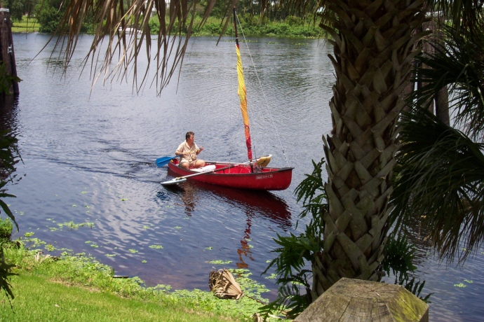 | Alva is a small town on the shores of the Caloosahatchee River. Its population is just a little over 2,000. The local boaters use the small island on weekends. I decided that instead of just staying overnight, we should stay for a week and practice with the canoe to see if I could somehow get it to sail. No such luck. The canoe would slide to whatever direction the wind was blowing. However, I did start to paddle around the island a little each day to strengthen myself. July and August are nesting season for alligators in Florida. Around the middle of June the female lays her eggs and about two months later they hatch. During this time they are particularly aggressive protecting their nests and their hatchlings. Every night, I could hear a gator bellowing from the east end of the island. I, therefore, avoided going for walks in that area but we would take walks to the west end of the island. From the moment we arrived, my dogs had been running loose. The first couple of days they would happily follow me when I went down the west trail to gather wood but, suddenly, they utterly refused to go down that trail again or even set a paw in the water no matter how hard I coaxed them. I will never know what frightened them. I can only assume that they had some kind of encounter with one of the alligators. I later found out from some locals who frequent the island that there are a couple of five- footers in the area. |