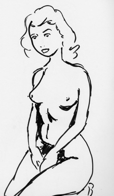 A nude woman sitting on her knees, hands in her lap. Free hand black marker.