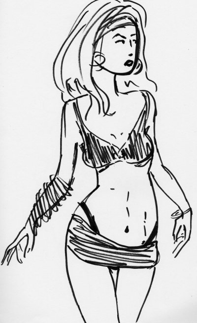 Woman in a micro mini skirt, free hand black marker.