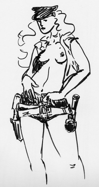 Shirtless woman in hot pants, dressed up as a cop. Free hand black marker.