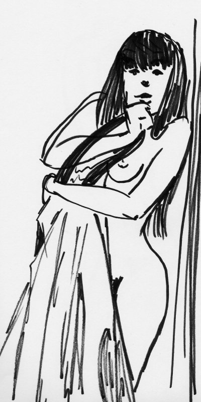 Nude woman holding a sheet in front of her. Free hand black marker.