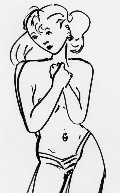 Pigtailed woman in bikini panties, free hand black marker.