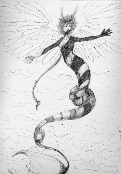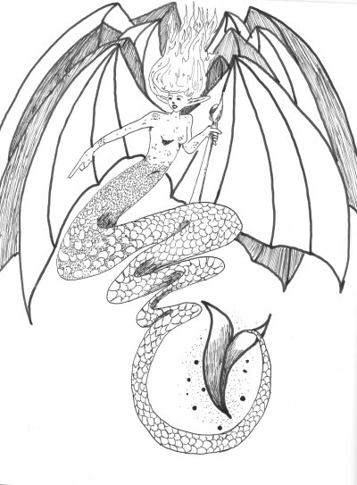 "Fire Elemental," India Ink over pencil. Two different pen nibs.