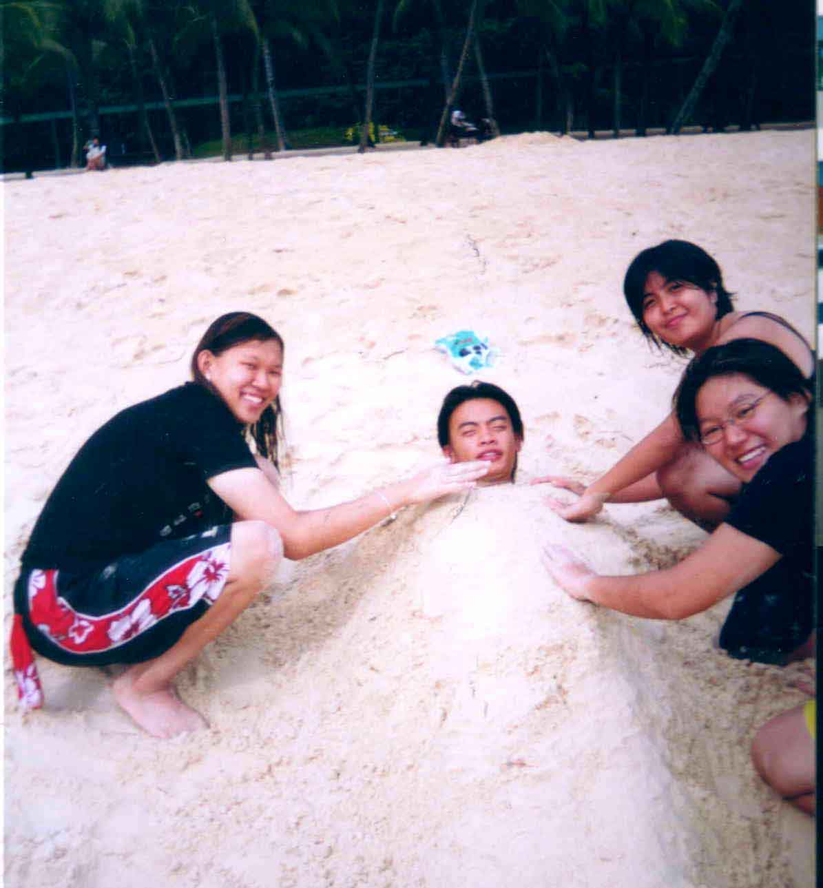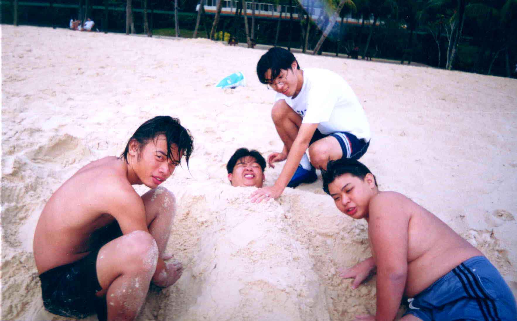 YEN HOUNG IS BEING BURIED IN THE SAND BY HIS 3 GOOD FRENZ... WAT'S HAPPENING??? |