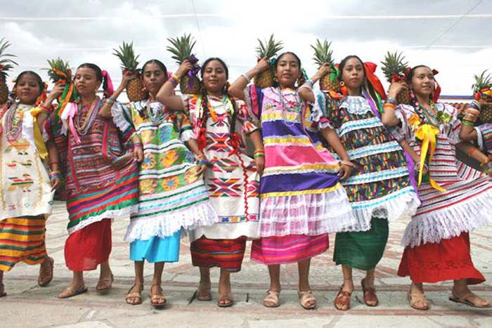Por lo general; en mujeres, vestidos de manta, adornada con bordados muy coloridos, y figuras, junto a un rebozo, igual, muy colorido, sabenusar listones en el pelo, al igual que collares elaborados por ellas mismas. Hombres; el de ellos más sencillo, consiste en una camisa de manga larga de manta, por lo general noes colorida, y un pantalón, del mismo material, usan sombrero de palma, y huaraches de cuero. parte de su vestimenta se usa aun en nuestra sociedad, como es el caso de elrebozo, en mujeres mayores, mientras que, el sombrero de palma, usado en zonas costeras, y el huarache, sandalia muy usada, tanto por jóvenes y adultos. ![]()