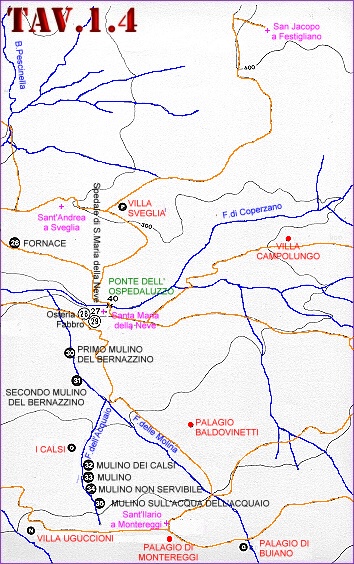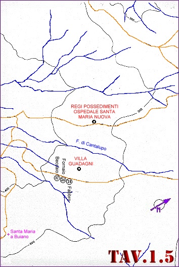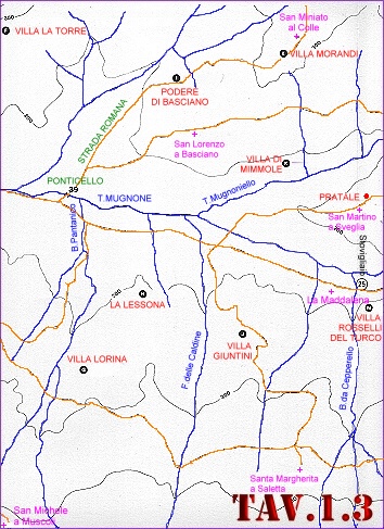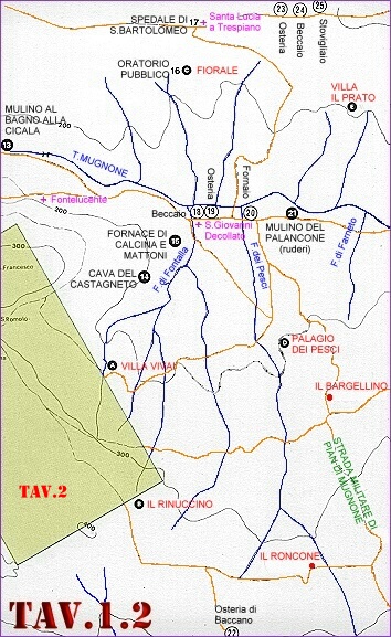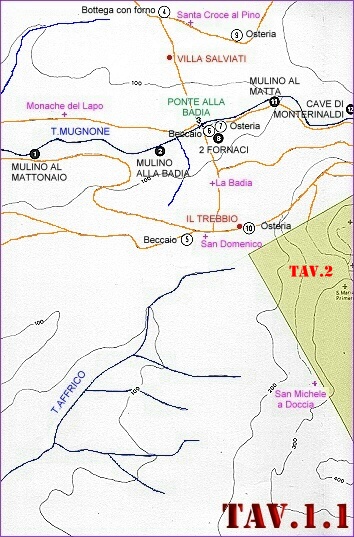 EDIFICI CIVILI EDIFICI RELIGIOSI ATTIVITA' ECONOMICHE Le TAVOLE 1 e 3 coprono l'intera valle del Mugnone e, per facilitarne la lettura, sono state suddivise in cinque settori consecutivi come rappresentato nel sottostante schema. Nella medesima figura, col rettangolo giallo, � anche schematizzata l'area di stretta pertinenza dell'abitato di Fiesole rappresentata in dettaglio nella TAVOLA 2. ![]() LEGENDA:
