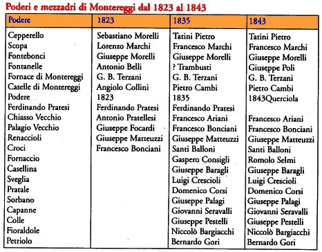 Negli anni presi in esame dalla presente ricerca, nella fattoria di Montereggi, si nota una buona stabilit� nelle presenze dei lavoranti; le variazioni che si notano, si svolgono spesso all'interno della stessa, o per motivi generazionali. In linea di massima, gli obblighi contrattuali prevedevano l'approvvigionamento delle sementi a carico per met� alle due parti. L'acquisto di piante da frutto, viti, ulivi, erano a carico della fattoria, considerandole una miglioria della tenuta. Cos� come le spese per lo scasso del terreno, o per fornire pali, canne, travette, occorrenti all'impianto delle nuove vigne. A carico dei mezzadri, il trasporto dei materiali e la messa in opera delle piante; oltre alla preparazione durante l'anno di piantoni di ulivo e propaggini di vite per procurare nuove piante da coltivare.