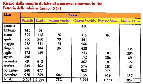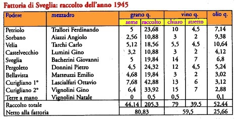 Se confrontiamo il raccolto di grano dell'anno 1925 della fattoria delle Molina (7 poderi) di quintali 237 complessivi, con il raccolto della fattoria di Sveglia (9 poderi) dell'anno 1945 di quintali 205 complessivi, vediamo che il risultato � inversamente proporzionale: i 9 poderi di Sveglia hanno prodotto il 15 % meno dei 7 poderi delle Molina.