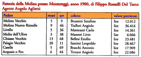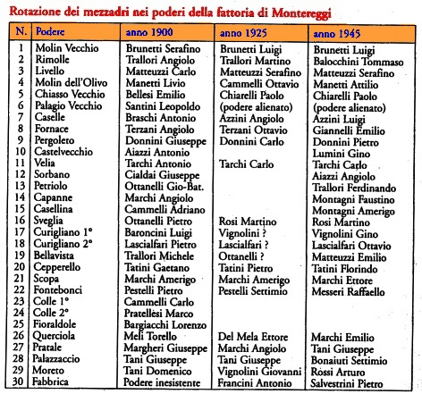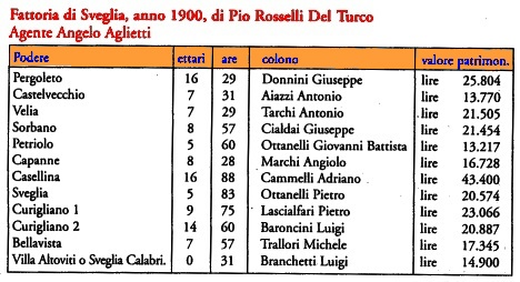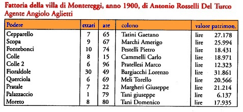 come possiamo vedere, i poderi complessivamente sono aumentati di 9 unit� (erano 20 nel 1866) nonostante siano stati ceduti a parenti o del tutto alienati diversi poderi ai margini della propriet�, tra i quali quelli prossimi all'Olmo, ceduti ai Guadagni, i Renaccioli nel popolo di Basciano e le Fontanelle di S. Domenico.