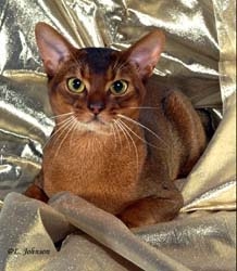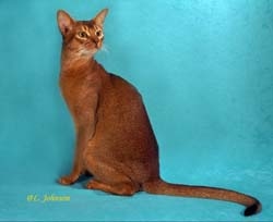 PELAGEM Densa, cerrada, el�stica ao toque, acamada. Pelo curto ou de comprimento m�dio nomeadamente, na zona da coluna dorsal. Pelagem caracterizada por um " ticking " ( duas ou tr�s faixas de cor, alternando o claro e o escuro em cada pelo e com a extremidade escura ) semelhante � da lebre e do coelho. O " ticking " n�o existe nos pelos das zonas em declive ( garganta, abd�men, face interna das patas ). De entre as cores reconhecidas, podemos citar : -- Lebre ( "normal" e mais tarde "usual" em ingl�s, " ruddy" em americano ) : riscas negras ou castanho-escuro num fundo alperce intenso. Couro do nariz vermelho tijolo, almofadinhas negras. --Azul ( blue ) : riscas azul acizentado forte num fundo beige intenso. Couro do nariz rosa escuro, almofadinhas cinzentas. Sorrel : riscas chocolate num fundo alperce. Couro do nariz cor de tijolo, almofadinhas castanho chocolate. --Fawn : riscas cinzento rosado sobre um fundo beige. Couro do nariz e almofadinhas rosa escuro. --Vermelho ( Red ) : riscas de um tom ruivo alperce alaranjado. Couro do nariz e almofadinhas cor-de-rosa. -- Silver ( Prateado ) : faixas do tipo lebre, sorrel, azul ou fawn num fundo prateado. O " Ticking " s� aparece nos gatinhos a partir da 6� semana de vida. |