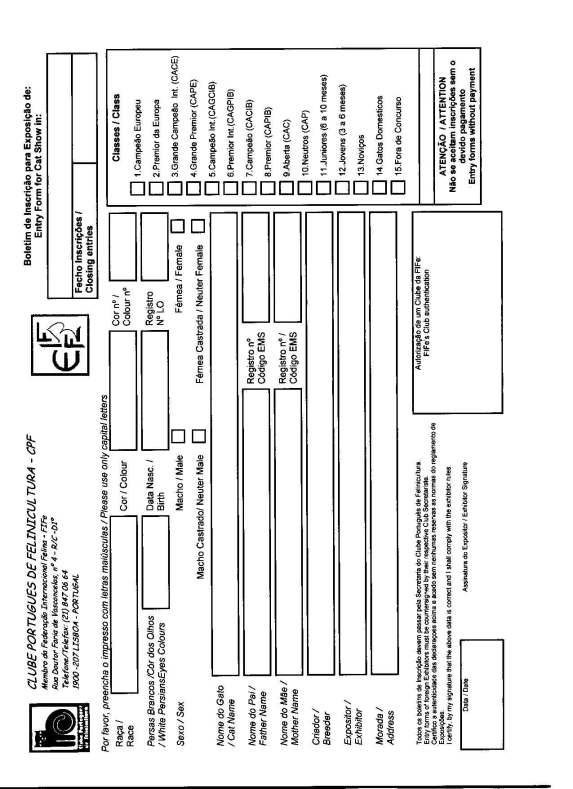 DEPOIS DE IMPRIMIR A FOLHA DE INSCRI��O PODER� ENVI�-LA, VIA TELEFAX OU POR CORREIO, , PARA O CLUBE PORTUGU�S DE FELINICULTURA.