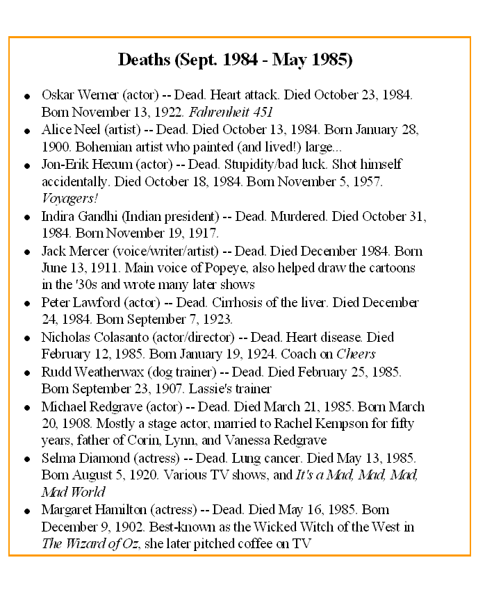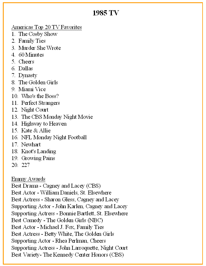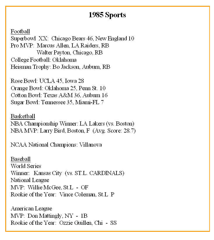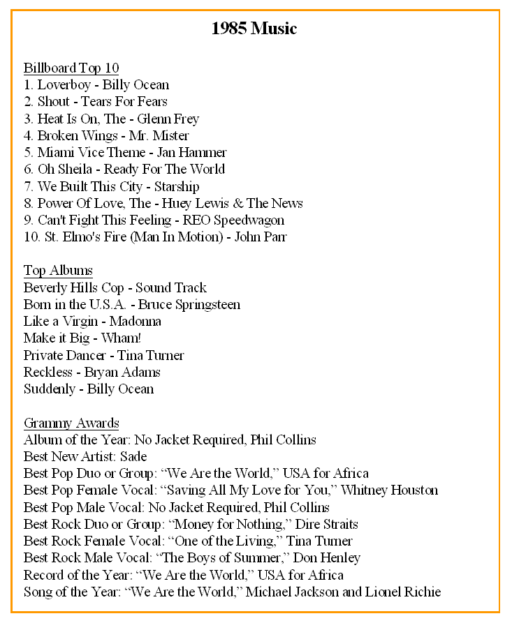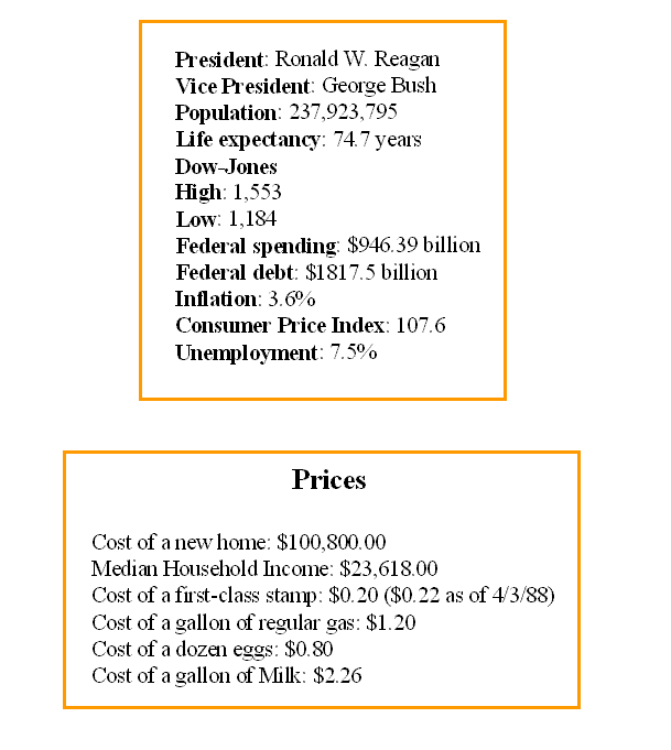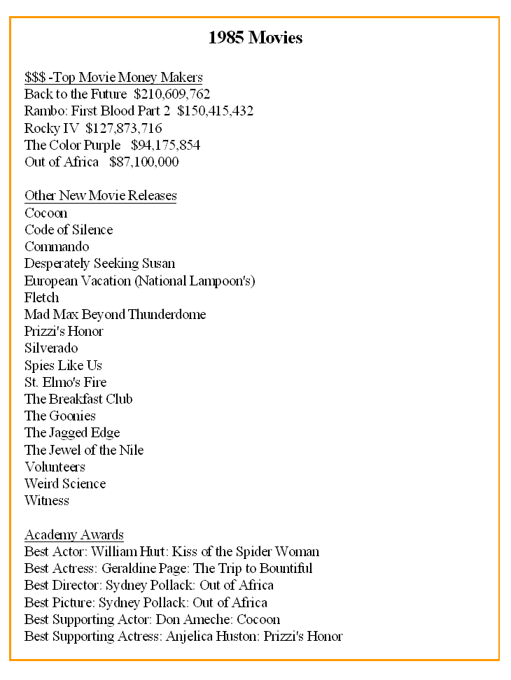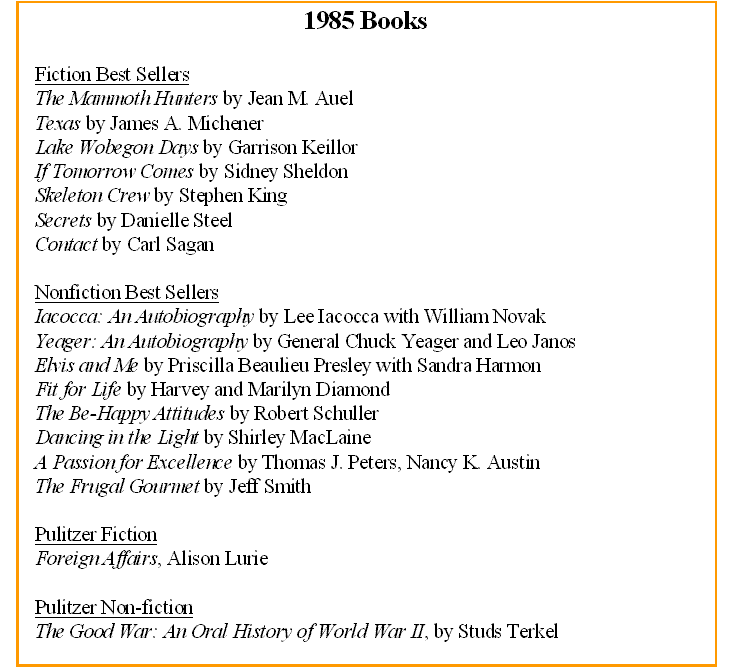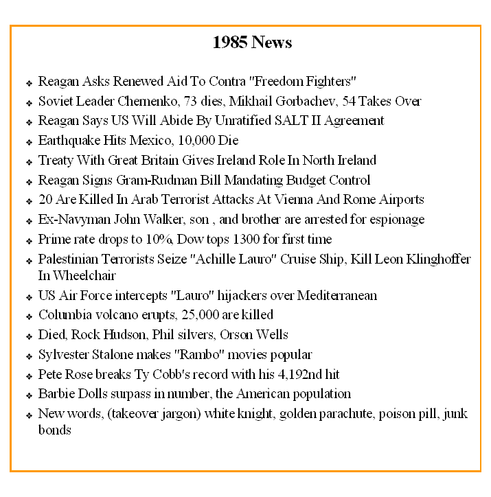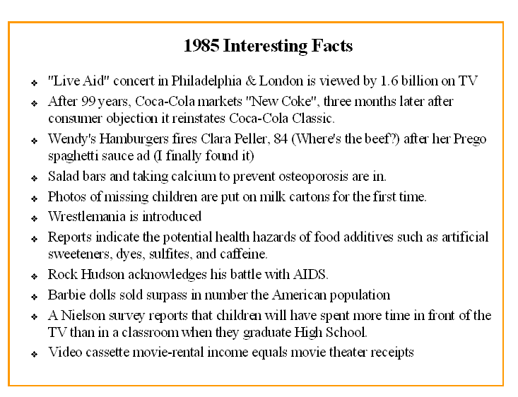 | Boy, has the world ever changed...here is a look back at 1985! If you have any interesting 1985 facts to add, please send it to us via E-mail. |