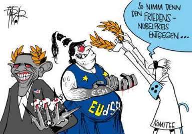 Dikigoros' Vorschlag: Man solle die ganze Bagage, die jenen Preis vergibt, nur mit einem Palmzweig und einer Friedenstaube bewaffnet, entweder nach Liberia oder in den Yemen schicken - dann würde sich das Problem binnen weniger Stunden ganz von selber erledigen...