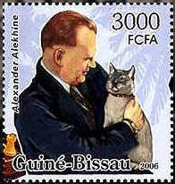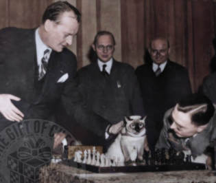 Dabei gerierte er sich gerne als Tierfreund und ließ sich ständig mit seinem häßlichen Kater fotografieren (neben dem er selber geradezu gutaussehend wirkte :-), als hätte er ihn als Talisman dabei. Tatsächlich hielt ihn, während er spielte, seine Frau im Publikum auf dem Schoß - seine Gegner und die Turnierleitung hätten ihm etwas gehustet, wenn er ihn während einer Partie auf seinem Schoß oder gar auf dem Tisch hätte sitzen lassen. (Man sieht auf den - gestellten - Fotos förmlich, wie unwohl sich das arme Tier dort fühlt.)
