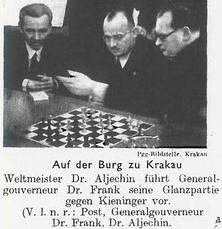 Dabei war es durchaus nicht so, daß Aljechin nicht auf sein Äußeres geachtet hätte - im Gegenteil, er war sogar ziemlich eitel. So achtete er z.B. darauf, daß er auf "offiziellen" Fotos keine Brille trug (wie Hitler :-) - die nahm er zuvor ab und hielt sie in der Hand. (Fotos, auf denen er doch mal "mit" zu sehen ist, sind entweder Schnappschüsse, die ohne sein Wissen und Wollen entstanden, oder Bilder, die vor Veröffentlichung beschnitten wurden - er konnte ja nicht wissen, daß irgendwann doch noch die Originale auftauchen würden :-)