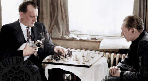 *********Da Dikigoros auch in seinen anderen Schachspieler-Lebensläufen je einen Film nicht nur erwähnt, sondern besprochen hat, will er sich hier nicht davor drücken, zumal es ein besonders interessanter Film ist, ebenso hervorragend "gemacht" wie inhaltlich fragwürdig. (Aber wie schrieb er oben: Wenn man schon lügt, dann sollte man sich wenigstens etwas Gutes, nein Besseres ausdenken - und das hat Jurij Wyschinskij zweifellos getan.) Dikigoros hat bewußt die Originalfassung auf Russisch verlinkt, denn in der Übersetzung ginge einiges verloren, vor allem, daß der Titelheld dort bis kurz vor Schluß Aljochin ausgesprochen wird - was bestimmt unzutreffend ist, denn der Film beginnt mit seinem WM-Titelgewinn 1927 gegen Capablanca, und da lebte er schon lange in Paris, wo er sich unzweifelhaft "Alekhine" schrieb und nannte. Wyschinskij [er]findet auch eine genial einfache Antwort auf die Frage nach dem Ende der Beziehung zwischen Aljechin und seiner 3. Frau: Die hat sich umgebracht, weil er sie mit seiner 4. Frau in spe betrogen hat - voilà! (Man sollte im Hinterkopf behalten, daß der Film während des "Kalten Krieges" gedreht wurde; da mußte die US-Amerikanerin halt die Böse sein, und die brave Russin ihr armes Opfer.) Wenig glaubhaft - wenngleich gut inszeniert - ist auch die Behauptung eines anderen Exilanten, der sich zur Rückkehr entschlossen hat mit der bereits im Filmtitel anklingenen Begründung, daß kein großer russischer Denker auf Dauer eben das sein könne, ohne "den weißen Schnee von Rußland". (Dikigoros würde das genaue Gegenteil behaupten: Ein Turgenjew, ein Dostojewskij, ein Tschajkowskij, ein
