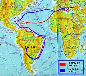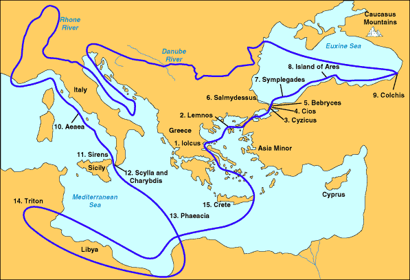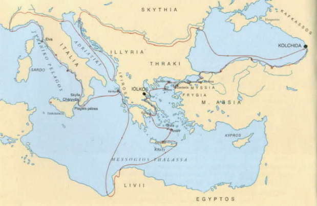 Und der Rückweg durchs Tyrrhenische Meer? Nun, der drängte sich ja zwingend auf, wenn man von der Ligurischen Küste zurück nach Hellás gelangen wollte. Einzelheiten hat Apollώnios wohl bei Hómäros abgeschrieben (wobei er die Kírkä zur "Tante" der Médeia macht :-), was uns freilich für die Lokalisierung der Odyssee wenig bringt, denn das zeigt nur, wo Apollώnios die sah, und nach Dikigoros' Überzeugung sah bereits er sie falsch, insbesondere was "Skýlla und Chárybdis" anbelangt, die man, wenn man sie in die Straße von Messina verlegen will, auch gleich in die Karibik versetzen kann... Aber darauf kommt es nicht an: Apollώnios macht diesen Teil der Reise offenbar mit dem Finger auf der Landkarte, und da er "Skýlla und Chárybdis" halt dort sehen will, stört es ihn wenig (ja, er merkt es wahrscheinlich gar nicht), daß die Beschreibung des Hómäros, wie wir im Kapitel über die Odyssee gesehen haben, gar nicht darauf paßt. Weiter geht es nach "Libýä [Afrika - nicht bloß das heutige Libyen]" (na klar - schließlich stammt Apollώnios von dort!), und von dort wieder nach Hause, das Apollώnios mit der herrschenden Meinung in Iωlkós vermutet, während Dikigoros wie gesagt glaubt, daß es ursprünglich Árgos war. Aber darüber, und wie die Geschichte dann weiter gegangen ist, schreibt er an anderer Stelle mehr.