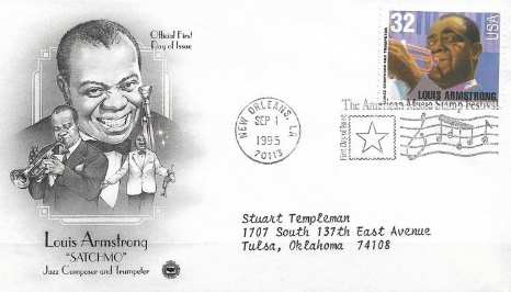 - Vielleicht war der Anlaß, daß man seinem Nachnamensvetter Neil A. bereits im Vorjahr eine besonders bemerkenswerte Briefmarke gewidmet hatte: Darauf zeigt er den Betrachtern, die noch immer an das Märchen von der Mondlandung 25 Jahre zuvor glauben, verdientermaßen einen Vogel; und der Nennwert beträgt sage und schreibe das 31(!)fache des Normalportos. (Irgendwie muß ja die Flagge finanziert werden, die da so munter im nichtexistierenden Mondwind flattert :-) Im Gegensatz zu jenem Jux ist die Marke mit Louis Armstrong tatsächlich gelaufen - Dikigoros hat extra ein Exemplar mit Normal-(nicht Sonder-)Stempel heraus gesucht -; und er hat sogar einen Ersttagsbrief gefunden, der gelaufen sein könnte. (Auf die Abbildung der vielen anderen, die garantiert nicht gelaufen sind, verzichtet er :-)