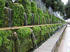 Der Rest des letzten Reisetages steht zur freien Verfügung der Reisenden. Tja - wie verbringt man einen "freien" Nachmittag in Rom? Die Möglichkeiten sind so vielfältig wie die Touristen - den typischen Amerikaner gibt es nämlich gar nicht. Die typische Amerikanerin übrigens auch nicht. Samantha z.B. mietet sich ein Auto und baut damit prompt einen Verkehrsunfall. (Das Bild halblinks oben auf dem o.g. Filmposter). Der geschädigte Herr würde sich vielleicht von ihr becircen lassen; aber seine vierschrötige Beifahrerin ist gewillt, ein Exempel zu statuieren: Sie stößt Samantha kurzerhand in einen der berühmten italienischen Brunen und ruft die Polizei, die sie ins Gefängnis steckt, aus dem sie Charlie später abholt und ihr als kleine Entschädigung eine spätabendliche Einzelführung durch die "Villa d'Este" bietet. Nein, mit "Villa" ist kein Gebäude gemeint, sondern - wie in Rom üblich - der Garten drum herum, und damit sind wir wieder beim Thema. (Damals stand er noch nicht auf der berüchtigten "Weltkulturerbe"-Liste der UNESCO und war noch nicht dauernd von Reisegruppen überlaufen.) Er ist berühmt für seine Brunnen - im Film sehen wir allerdings nur die Allee der cento fontane - vielleicht weil die, im Gegensatz zu einigen anderen, zu klein sind, um hinein zu fallen (oder gestoßen zu werden :-)? Ob es wirklich 100 sind? Dikigoros hat nicht nachgezählt - muß er auch nicht, denn der Film thematisiert das nicht.