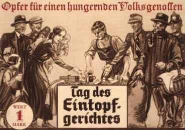 "Was für'n Unsinn," entgegnete Grete, "es gibt doch schon einen fleischlosen Tag in der Woche, den Freitag, da wird nur Fisch gegessen, wir sind schließlich ein christliches Land." - "Erstens sind die von der G-Partei überwiegend keine Christen, sondern Muslime oder Atheisten, und zweitens wollen die, daß wir auch keinen Fisch essen." - "Wie wollen die denn das kontrollieren? Soll da ein Blockwart durch die Häuser gehen und herum schnüffeln, wer was ißt? Und was passiert, wenn sie jemanden erwischen, der doch Fleisch ißt? Wird der dann verhaftet und eingesperrt?" - "Also erstens wird das nicht 'Blockwart' heißen, sondern 'Navigator', das klingt viel besser und bezeichnet neuerdings in den USA die staatlich besoldeten Spitzel, die überall herum schnüffeln, um heraus zu bekommen, ob auch jeder krankenversichert ist, und solche Fremdwörter übernehmen wir ja gerne; und zweitens brauchen sie das in den meisten Fällen gar nicht, sondern das geht wie bei Orwell in '1984': In alle neuen Fernsehgeräte sind Überwachungschips eingebaut, und da die meisten Leute vor laufendem Fernseher essen..." - "Ich nicht." - "Dein alter Kasten hat eh noch keinen solchen Chip, also laß dir bloß keinen neuen aufschwatzen." - "Und wie kommst du darauf, daß die das den Nazis abgeguckt haben?" - "Ja, gab es da nicht auch einen Eintopftag pro Woche?" - "Aber mein lieber Junge, wo denkst du hin? Die hätten sich doch nicht so lächerlich gemacht wie die Politiker heute! Damals hat niemand 7x pro Woche Fleisch gegessen, sondern unter der Woche Mehlspeis, Eier, Krautfleckerln oder Suppen, und vielleicht am Sonntag 1x Fleisch, weil das so teuer war. Und weil der Ley Spendengelder fürs Winterhilfswerk brauchte, ist er auf die Idee gekommen, daß die Leute im Winter an jeweils einem Sonntag im Monat statt Fleisch etwas Billigeres essen und die Differenz spenden sollten; wenn sie das taten, bekamen sie eine Anstecknadel, und niemand hat gefragt, ob sie trotzdem Fleisch gegessen haben oder nicht." [Anm. Dikigoros: Da hatte Grete etwas durcheinander gebracht: Weder das "Winterhilfswerk" noch der "Eintopfsonntag" - oder "Tag des Eintopfgerichtes", wie er offiziell hieß - unterstanden Robert Ley, sondern dem in der Öffentlichkeit weniger präsenten Erich Hilgenfeldt, über den Dikigoros an anderer Stelle schreibt. Dieser leitete die so genannte "NS-Volkswohlfahrt", zu der ein gutes Dutzend Hilfsorganisationen zählten, u.a. das "Ernährungshilfswerk" und das "Winterhilfswerk". Für alle wurde getrennt gesammelt; beim "WHW" bekamen Spender eine Anstecknadel; bei anderen Gelegenheiten, u.a. beim "Eintopfsonntag", gab es bloß eine Art Sammelbildchen mit Wertangabe.]