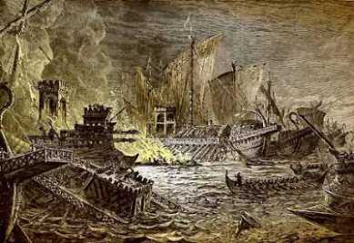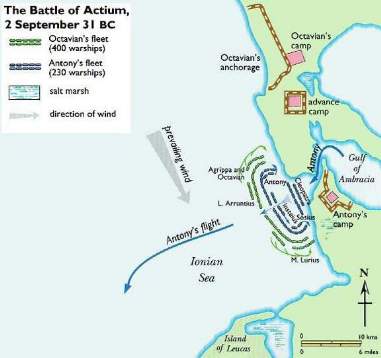 Griechenland, September 31 v.C. Vor Kap Agde (auf Griechisch Anaktorion - später Aktion - , auf Lateinisch Actium), unweit der Grenze zwischen den römischen (SPQR = "sono pazzi questi romani", pardon, "senat populusque romanum") Provinzen Macedonia und Achaia, sammeln sich die Bürgerkriegsparteien zum Entscheidungskampf. Gegen den Rat seiner Generäle beschließt Antonius, obwohl er 200.000 Mann Fußtruppen hat, mit 20.000 Mann zur See anzugreifen, und zwar nicht einfach die römische Flotte, sondern ganz gezielt das Flaggschiff des Octavian, in der Hoffnung, diesen dort zu erwischen - dann wäre der Krieg gewonnen. Er bricht auch durch und erobert das Flagschiff - aber Octavian ist nicht drauf, und nun macht Admiral Agrippa, der die Gegenseite kommandiert, die Falle zu und schneidet ihn ab. Kleopátra läßt die griechische Flotte wenden und fährt mit ihr zurück nach Ägypten, gefolgt von Antonius, dem es gelungen ist, auf einem kleinen Segler zu entkommen. Nun sitzen sie wieder in Alexandria wie die begossenen Pudel und harren der Dinge (und der Personen, vor allem Octavians und seiner Truppen :-), die da kommen sollen. Soweit die gekürzte Fassung, die sich über die Motive der Handelnden nicht weiter ausläßt. Der Langfassung entnehmen wird folgendes: Kleopátra glaubte, daß Antonious bei dem Versuch, Octavian zu stellen, umgekommen sei und daß keine Hoffnung mehr bestehe, deshalb ist sie nach Ägypten zurück gesegelt; aber Antonius - der sie wirklich liebte - glaubte, daß sie ihn aus persönlichen Gründen verlassen habe und ist deshalb so völlig niedergeschlagen, daß er seine Truppen mitten in der Schlacht im Stich läßt und ihr hinterher fährt.