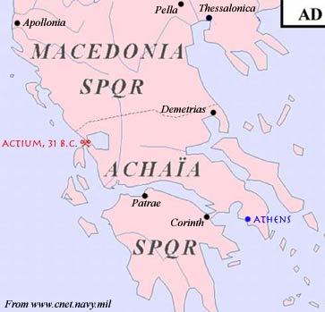 Halt, liebe Leser, es ist erneut Zeit für eine Denkpause. Über den Verlauf der Schlacht von Actium wissen wir sehr wenig; aber wir wollen versuchen, anhand des wenigen, das wir wissen, auch dem Antonius Gerechtigkeit widerfahren zu lassen. Warum entschied er sich für die See- und gegen die Feldschlacht? Gegenfrage: Wart Ihr mal vor Ort? Wenn nicht, macht doch bei Gelegenheit mal Urlaub auf Levkás (oder, wie es heute auf Pidgin-Griechisch heißt, "Levkáđa", aber nicht "Lefkas", wie manche deutsche Touristen schreiben - die dort zum Glück rar sind, obwohl es viel billiger ist als etwa auf Korfu). [Für Schwule und Lesben ist das übrigens moralische Pflicht (fast wie die Pilgerreise eines Muslims nach Mekka), denn dort - nicht auf Léswos - soll sich die berühmte ßapfóo (so nannte man sie dort; in ihrem Heimatdialekt - dem Aiolischen - hieß sie "Psápfa"; bloß "Sappho" hieß sie zu Lebzeiten nie und nirgends :-) in ihr Schwert, pardon von den Klippen gestürzt und so den Tod gefunden haben.] Angesichts der heutigen Verhältnisse auf dem Balkan werdet Ihr wahrscheinlich per Flugzeug anreisen und in Préwesa (bitte nicht mit "v" transkribieren, wie das neuerdings Mode geworden ist, es schreibt sich auf Griechisch auch heute noch mit einem "beta/wita"!) landen. Legt dort einfach mal einen Tag Pause ein und nehmt Euch die Zeit, runter zum Hafen zu gehen, statt den Touristen zu folgen, die gedankenlos in die andere Richtung fahren, um die Ruinen von Nikopolis zu besichtigen, das Octavian nach seinem Sieg erbauen ließ. (Übrigens als Konzentrationslager für Deportierte aus ganz Hellas - Dikigoros hat den Vergleich oben nicht umsonst gewählt. Aber davon erzählt man Euch heuer nichts mehr, nur daß es ein schönes Bad gab, vermutlich auch Duschen, und sogar ein Orchester, wie in Auschwitz.) Dort habt Ihr einen prima Blick nach Süden auf Kap Agde am gegenüber liegenden Ufer. Und rechts (westlich) davon fand die große Seeschlacht statt.