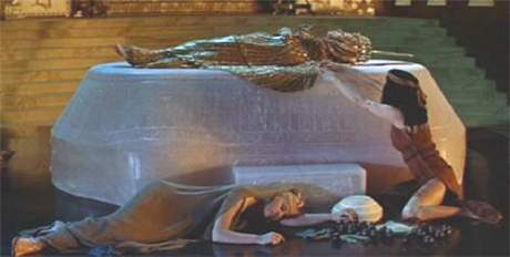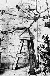 Wenn Dikigoros eingangs geschrieben hat, daß keine Frau der Antike die Nachwelt so sehr fasziniert habe wie Kleopátra, dann muß er das jetzt präzisieren. Er hat oben bewußt nicht geschrieben, daß ihr Leben die Nachwelt so gefesselt habe; denn ein Gutteil jener Faszination ging und geht vielmehr von ihrem Tode aus (wie das so ist - aber darüber schreibt Dikigoros an anderer Stelle mehr) bzw. dessen geheimnisvollen Umständen. Bis heute wissen wir nur, daß Octavian nach seiner Rückkehr nach Rom (er ließ statt der lebenden Kleopátra eine Statue von ihr im Triumfzug mitführen) durch seinen Marionetten-Senat als offizielle Version verkünden ließ, daß sie sich durch einen Schlangenbiß selber habe töten lassen. [Als Motiv gab schon ein gewisser Horaz - über den Dikigoros an anderer Stelle mehr schreibt - in seiner 37. Ode ("Nunc est bibendum [Nun sei getrunken]...") an, sie habe sich die Schande des Triumfzugs ersparen wollen.] Ob in den Hals, in die Brust oder in die Hand, ist nicht überliefert und bis heute Gegenstand ebenso lebhafter wie müßiger Diskussionen. (Klickt den Link trotzdem an, liebe Leser; er ist es wenn nicht des Textes, so doch der Bilder wegen wert.) Manche meinen auch, daß sie sich das Schlangengift irgendwie anders (z.B. versteckt in einer hohlen Haarnadel) beigebracht habe, weil es wohl doch schwierig gewesen wäre, lebende Schlangen in ihr Verlies - sie war schließlich in römischer Gefangenschaft und gut bewacht - einzuschmuggeln. Aber wer so spekuliert, macht sich falsche Vorstellungen von der Unterbringung und Behandlung römischer Gefangener. [Die Rheinwiesen bei Remagen und die Folterkeller von Nürnberg haben nicht erst die US-Amerikaner erfunden, auch wenn Ihr, liebe ältere Leser, die Ihr die "Befreiung" von 1945 noch mit erlebt und überlebt hat, das glauben mögt.] Bei Mankiewicz darf sich Kleopátra weiterhin mehr oder weniger frei in ihren eigenen Gemächern bewegen, mitsamt ihren Dienerinnen. In Wahrheit dürfte sie sich mehr oder weniger nackt und angekettet in einem Kerker befunden und keinerlei Möglichkeit gehabt haben, Selbstmord zu begehen - wenn Octavian sie denn hätte am Leben lassen wollen. Und Nadeln im Haar dürfte sie auch keine mehr gehabt haben, allenfalls in anderen Körperteilen; bei den alten Römern war es üblich, Gefangene beiderlei Geschlechts ordentlich zu foltern (jawohl, ordentlich im Sinne von ordnungsgemäß, vom "Carnifex [Hackfleischmacher]" höchstpersönlich; und Jungfrauen wurden zuvor von demselben ordentlich vergewaltigt, weil das Gesetz es verbot, Jungfrauen zu foltern und hinzurichten, da war man ganz korrekt, wie auch heute im Iran :-), zumal wenn man etwas von ihnen wissen wollte. (Im Film fragt Octavian die Kleopátra nur ganz beiläufig, wo denn Caesarion abgeblieben sei, aber sie verrät es ihm nicht; dennoch erwischt er ihn später - wie wohl?) Das - nicht irgend ein besonderes Ehrgefühl, wie bei den alten Japanern, oder die Angst, auf einem Triumfzug mitgeführt zu werden - war der Grund, weshalb geschlagene Generäle, die keine Chance mehr sahen, die Seiten zu wechseln, es so oft vorzogen, sich in ihr Schwert zu stürzen! Wenn Ihr mal in London wart, liebe Leser, dann habt Ihr vielleicht am Ufer der Themse einen Obelisk aus der Zeit Kleopátras stehen sehen, den die Briten - in vielerlei Hinsicht die geistigen Erben der Alten Römer, die sich auch mit der Folter sicher besser auskennen als die meisten anderen Völker der Welt - im 19. Jahrhundert aus ihrer damaligen Kolonie Ägypten gestohlen haben und dem sie einen bezeichnenden Namen gaben: "Cleopatra's needle [Kleopátras Nadel]"; er ähnelt halt in ihren Augen dem Gerät, das Ihr unten rechts abgebildet seht, wie es früher beim Verhör zur "Wahrheitsfindung" in Gebrauch war und ursprünglich "Judas cradle" hieß (eine Bezeichnung, die heute aus Gründen der politischen Korrektheit nicht mehr verwendet wird - die Juden könnten sich ja auf den Schlips getreten fühlen; Kleopátra kann sich dagegen nicht mehr beklagen :-).