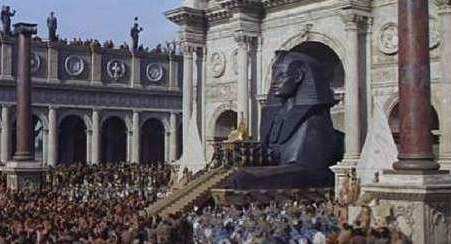 Aber Dikigoros hat schon wieder vorgegriffen. Noch lebt Caesar, noch regiert er Rom. "Regiert"? Nein, dieses Wort hätten die Römer nicht gebraucht, denn es kommt von "Rex", König. Und daß irgend ein Herrscher, egal mit welcher Machtfülle ausgestattet, sich "Rex" nennen könnte, das war so undenkbar, als wenn sich heute irgend ein Herrscher, egal mit welcher Machtfülle ausgestattet, "Führer und Reichskanzler" nennen würde - es war Anáthema. [Insofern ist es besonders pikant, daß Caesars Rolle ausgerechnet mit einem Schauspieler namens "Rex" besetzt wurde. Und da wir gerade beim Thema sind: Es wäre auch undenkbar, einem englischen König den Vornamen des Schauspielers zu geben, der den Marcus Antonius spielt: Zwar gelten alle drei Richards als große Feldherren, Richard Löwenherz aus unerfindlichen Gründen sogar als großer Herrscher, aber Richard III wurde von der Tudor'schen Propaganda in einem solchen Maße zum "Teufel in Menschengestalt" verzerrt wie es erst wieder im 20. Jahrhundert mit Wilhelm II und Hitler geschehen sollte, und das wirkt bis heute fort.] Doch nun hat der Senat Caesar endlich zum "Dictator" (das ist wörtlich der, "der das Sagen hat") und zum Imperator ernannt - auf Lebenszeit! Wo ist da bitte noch der Unterschied? Das fragt sich im Film auch Kleopátra, als sie im fernen Alexandria diese Nachricht erhält. General Rufus versucht, es ihr behutsam zu erklären, aber sie ist nicht zu bremsen - schließlich hat sie drei Jahre darauf gewartet, Caesar wieder zu sehen - und bricht sogleich nach Rom auf. Im Film gönnt Mankiewicz ihr (und dem kleinen Caesarion) aus diesem Anlaß einen pompösen Auftritt dortselbst, der jeden Triumfzug in den Schatten stellt. Und der Pöbel, pardon das Volk jubelt ihr zu.
