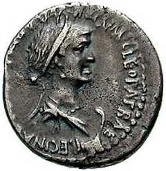 Marcus Antonius ist schwieriger. Seine Biografen behaupten zwar, daß er seinem Namen alle Ehre gemacht habe ("Antonius" ist die lateinische Form des griechischen "Adonis") und aussah wie eine Statue des Hercules (das ist die lateinische Form des griechischen "Rehakles", pardon "Härakläs [Ruhm der (Göttermutter) Hära]"). Nun, auf seinen Körper mag das zugetroffen haben. [Er trug bevorzugt Mini, nicht nur den Waffenrock, sondern auch die Toga stets hoch gerafft, damit jeder (und jede :-) seine schönen, muskulösen Oberschenkel sehen konnte, deshalb war es eine schlechte Idee von Mankiewicz, ihm einen General auf seine flapsige Bemerkung, nackt sehe eine Königin auch nicht anders aus als andere Frauen, erwidern zu lassen, daß ein Feldherr nackt auch nicht anders aussehe als andere Soldaten.] Aber sein Gesicht war ausweislich der erhaltenen Münzprägungen das eines fetten, verlebten Säufers; das Denkmal, das Arthur Strasser - wohl in Anlehnung an die Büste im Budapester Museum der schönen Künste - für die Weltausstellung von 1900 in Paris schuf (heute steht es in Vindobona, pardon in Wien) kommt ihm wahrscheinlich recht nahe - jedenfalls viel näher als das des ranken und schlanken Richard Burton, wie Mankiewicz ihn im schnittigen Zweispänner bei Calpurnia vorfahren läßt. Vielleicht erinnerte er Kleopátra an ihren Vater? Dikigoros erinnert er am ehesten an einen anderen Italiener, der sein Glück auch im östlichen Mittelmeerraum suchte und jämmerlich scheiterte; doch das ist im Vergleich mit den anderen Parallelen etwas weit hergeholt, und Dikigoros besteht nicht darauf; wenn jemand eine bessere Idee hat, läßt er sich gerne belehren.