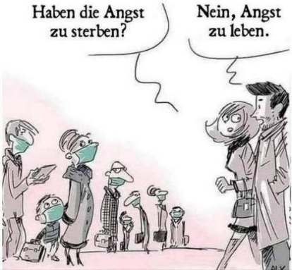 Dann gab es - aber schalten wir hier ruhig wieder ins Präsens um - dann gibt es natürlich die vielen, die schlichtweg Angst haben, die gewissermaßen "unschuldig" Angst haben, echte Angst vor dem Sterben, vor dem Ersticken [doch höchstens unter der ansonsten unnützen FFP2-Maske, Anm. Dikigoros], vor dem Verlust ihres einen einzigen Lebens. Sie bilden die womöglich unheilbare Gruppe derer, die auch "nach Corona" die habitualisierten Hygieneregeln freiwillig beibehalten werden. Die schon das nächste Killervirus mit rechthaberisch-fatalistischem Grauen herbei fürchten. Bei all diesen zu Tode geängstigten armen Seelen, die allein auf weiter Flur, allein im Wald, allein im Auto eine medizinische Maske tragen, hat der Dauer-Alarmismus der Medien immer wieder leichtes Spiel, da er auf eine entsprechend empfängliche Charakterstruktur trifft: die zeittypische maligne Mischung aus Haben-Orientierung, spirituellem Vakuum und Furcht vor der Freiheit.