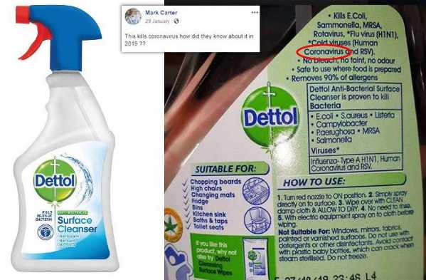 The post features an image of the back label of a bottle of Dettol, a widely-available disinfectant brand sold by consumer goods firm Reckitt Benkiser. The label, which is dated October 27, 2019, claims the product “Kills E.Coli, Sammonella [sic], MRSA, Rotavirus, Flu virus, Cold viruses (Human Coronavirus and RSV)."
