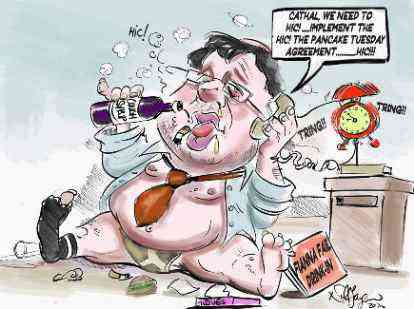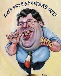 **Daß Cowen daneben noch irgendwelche weiter führende Schulen - u.a. eine Klosterschule in Tipperary - oder gar die Universität Dublin "besucht" haben soll (nicht nur zum Besuch der Cafeteria, sondern als ordentlicher Student :-), wie sein offizieller Lebenslauf behauptet, dürfte ein Märchen sein. Er selber hat einmal gesagt, daß er seine Erziehung in der väterlichen Kneipe erhalten habe. (Zu dieser Erziehung gehörte offenbar auch, wie man Steuern hinterzieht - was aber erst später durch die Ungeschicklichkeit seines Bruders heraus kam :-) Auch daß er ein großer Football-Spieler war erscheint angesichts seiner Figur wenig glaubhaft, ebenso daß er, bevor er mit 24 Jahren Abgeordneter wurde, längere Zeit als Rechtsanwalt praktizierte. (Er mag Ehrenmitglied des Gälischen Sportbunds [G.A.A.], Vorsitzender des Stadtsportbundes von Clara und Ehrenmitglied der Rechtsanwaltskammer Dublin sein; aber ersteres bedarf keiner aktiven sportlichen Betätigung, und letzteres können auch Nicht-Juristen werden. Vielleicht haben seine Biografen