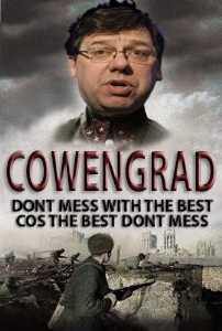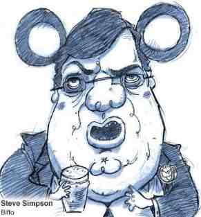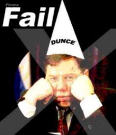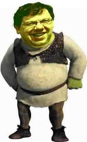 Ebenfalls ein Märchen dürfte die Nachricht sein, daß Cowen 2012 nach Kalifornien ausgewandert sei, um dort ein Studium der Wirtschaftswissenschaften aufzunehmen. Biffo wird allenfalls eine Zechtour durch die Kneipen Kaliforniens unternommen haben; das im www kursierende Bild, das ihn im Hörsaal zeigt, ist entweder gestellt oder eine Fotomontage. ***In Offaly begann 1556 der Versuch Englands, Irland mittels Zwangsansiedelungen zu "anglisieren", wofür sich aber nur die dümmsten und ärmsten Bauernknechte hergaben. Seitdem gilt Offaly als die Grafschaft mit der dümmsten Bevölkerung Irlands überhaupt. Biffos PR-Berater versuchen später dagegen zu halten, indem sie ihn als Doppelgänger von "Shrek", einer beliebten Märchenfilmfigur, aufbauen; andere ziehen allerdings eher Vergleiche mit "Dick und Doof". In Frankreich nennt man ihn auch "Bouffo [Freßsack]" (von "bouffer [fressen]".)