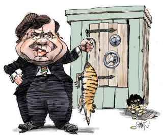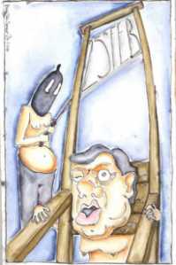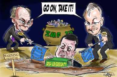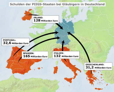 Wer nicht wissen sollte, wie das in der Praxis vor sich geht, betrachte die mittlere Karikatur oben: Die Mitglieder der Eurozone dürfen zwar selber kein Geld mehr drucken, aber weiterhin Statsanleihen auflegen - auch in Euro. Da diese jedoch auf den freien Finanzmärkten der Welt nirgendwo mehr absetzbar sind - allenfalls zu einem Bruchteil des Nennwerts - kauft sie die Europäische Zentralbank zum vollen Nennwert und in unbegrenzter Höhe auf. Es wird also genau das Gegenteil dessen bewirkt, was die Gründung des Euro-Raums - angeblich - verhindern sollte: das unbegrenzte Schuldenmachen der Mitgliedsländer. Dieses erfolgt nun allerdings nicht mehr auf Kosten und Risiko der Emittenten und Käufer, wie bisher, sondern der Allgemeinheit der europäischen Steuerzahler. De facto erfolgen diese Aufkäufe à fond perdu, d.h. die Einlösung jener "