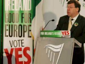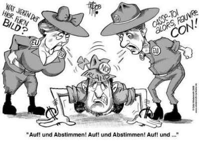 ********Durch ein Versehen wird das amtliche Endergebnis - eine Zweidrittelmehrheit für die neue Verfassung - schon bekannt gegeben, bevor mit der Auszählung offiziell auch nur begonnen worden ist; dem Auszählungsverfahren steht somit die Fälschung ins Gesicht geschrieben. Jeder in Irland weiß, daß die Abstimmung in etwa so korrekt verlaufen ist wie die im selben Jahr veranstalteten "Wahlen" in Afģānistān. In einem Fernseh-Interview hält sich Cowen diesen Sieg persönlich zugute: Vor der ersten Abstimmung hatte er einräumen müssen, den Vertrag selber nicht gelesen zu haben; inzwischen habe er das nachgeholt, was die Wähler sicher zu schätzen wußten.